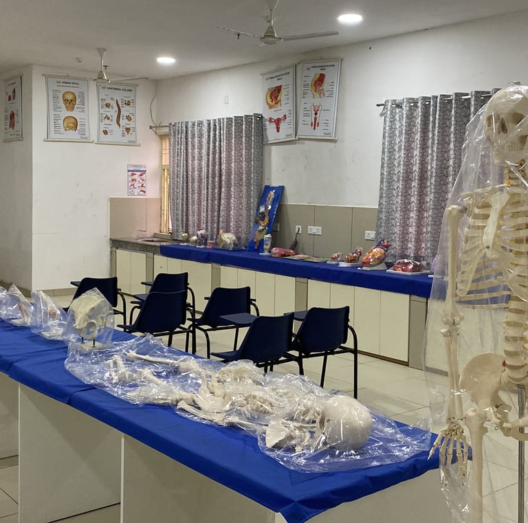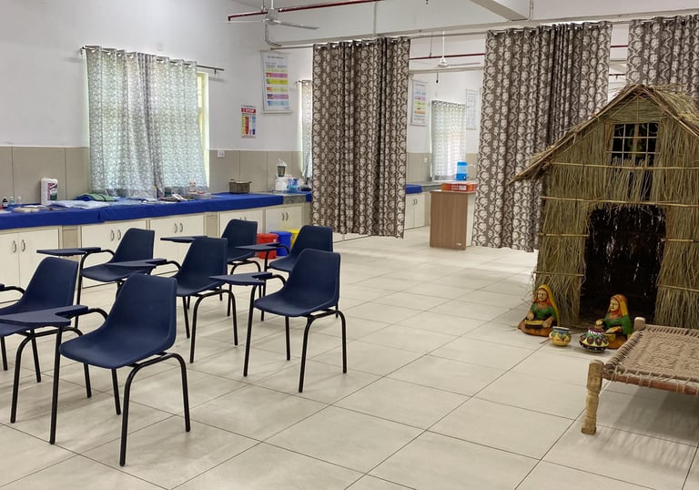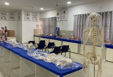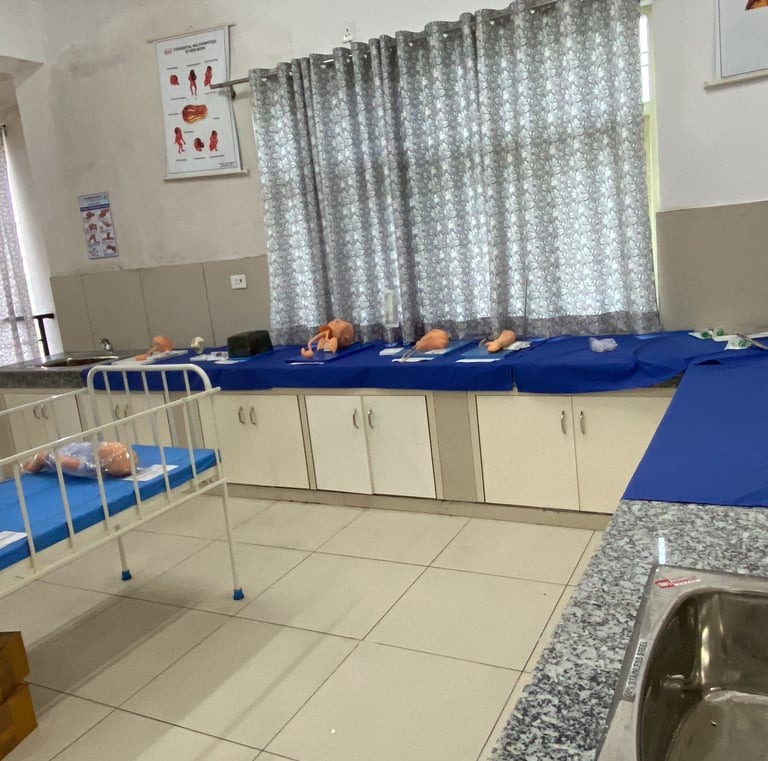 Equipped with detailed models of the female reproductive system child birth simulators , Utrine development models and newborn care essentials, this laboratory allows students to practice antenatal care, delivery techniques, and suturing procedures like episiotomy. The lab fosters confidence and competence in maternity and child health nursing through realistic simulation and practice.