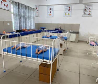 Focused on modern pediatric nursing practices, this lab provides students with resources to handle neonatal and childhood care confidently. Equipped with CPR mannequins, pediatric procedure models, and necessary supplies, students get extensive practical exposure to procedures like oxygen therapy, IV therapy, feeding techniques, and play therapy, complemented by audio-visual aids for enhanced learning.