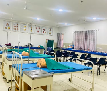 A spacious, well-ventilated facility designed to accommodate 100 students for practical training. Equipped with contemporary instruments, linen, lockers, mannequins, and dummy models, this lab provides hands-on training in core nursing skills. Students practice fundamental procedures such as bed making, personal hygiene, and advanced techniques including CPR, nebulization, and cardiac monitoring, guided by experienced faculty.